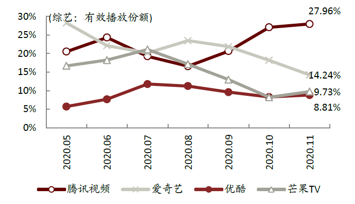 综艺方面,继承湖南卫视强大创作基因的芒果TV以及“财大气粗”的腾讯视频在综艺自制领域均可圈可点,爱奇艺也并无明显优势。