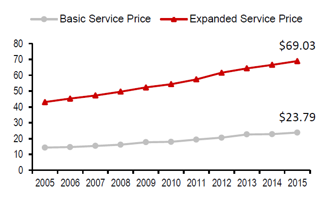 从价格方面来看,由于付费频道的节目优质性以及分发渠道的垄断性,美国有线电视平均订阅价格逐年攀升,2015年基础服务和拓展服务的每月订阅价格分别高达23.79美元和69.03美元。
