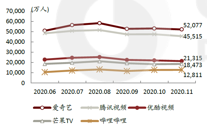 从用户规模的角度,爱奇艺同样是领跑者。截至2020年11月份,爱奇艺的月活跃用户数达到5.2亿,领先于劲敌腾讯视频,并大幅高于第二梯队的优酷、芒果和B站。同时,爱奇艺的付费会员数在19年6月份突破1亿,也是国内首个破亿的长视频平台。