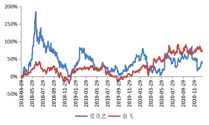 图4:奈飞股价涨幅(72%)是爱奇艺股价涨幅(41%)的1.8倍,资料来源:wind