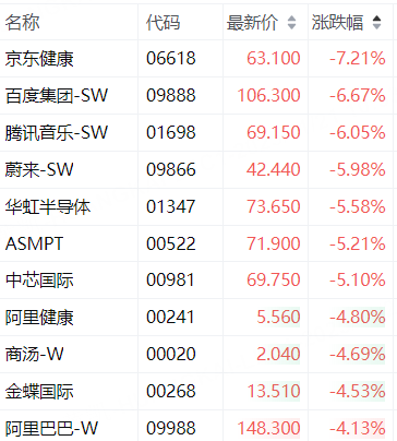 科指成分股中,京东健康跌超7%,百度集团-SW、腾讯音乐-SW跌超6%,蔚来-SW、华虹半导体、中芯国际跌超5%,阿里巴巴-W跌超4%。
