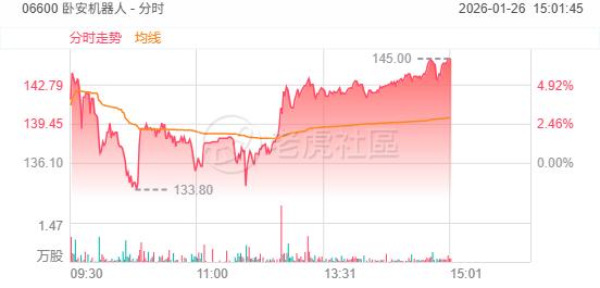 1月26日, 卧安机器人盘中涨超6%,高见145港元,再创上市新高。截至发稿,涨6.76%,报145.5港元,成交额约5441.36万港元。