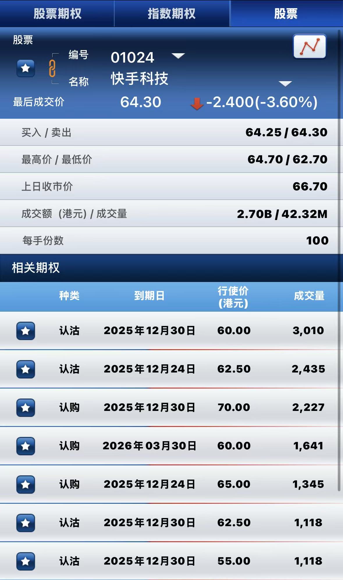 快手-W下跌3.6%,期权方面:半日成交超3万张合约,其中于12月30日到期行权价60港元的认沽期权成交量居前,成交超3000张合约。 $KST.HK 20251230 60.00 PUT$