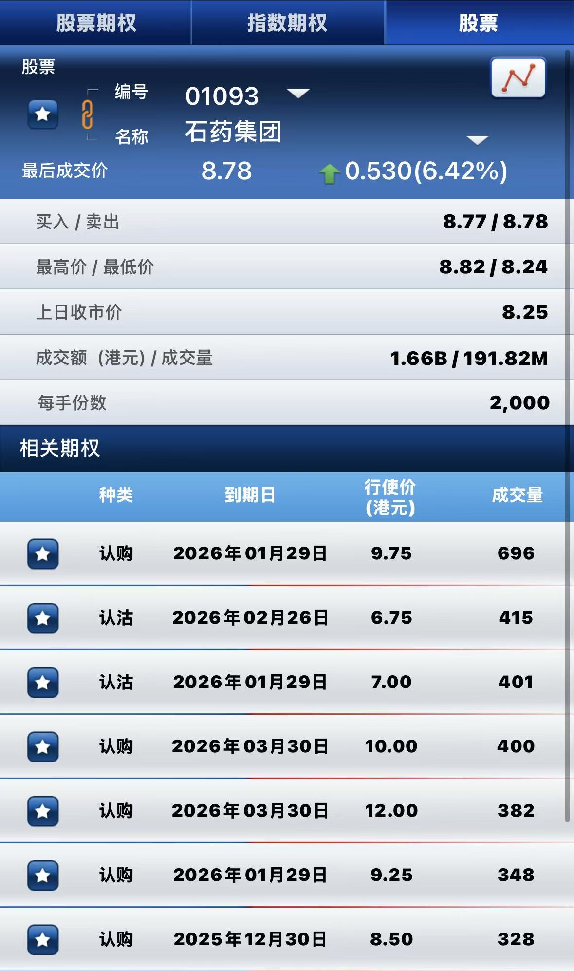 石药集团涨超6%,期权方面:半日成交近1万张合约,其中于2026年1月29日到期行权价9.75港元的认购期权成交量居前,成交近700张合约。