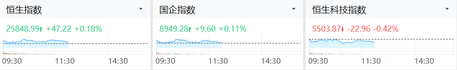 12月23日,港股三大指数涨跌不一,截止午间收盘,恒指涨0.18%,科指跌0.42%,国企指数涨0.11%。