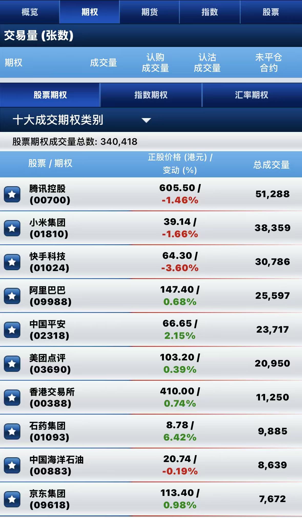 截止午间收盘,港股期权半日成交超34万张。其中,腾讯控股成交量居前,期权成交超5.1万张;小米集团-W名列次席,期权成交超3.8万张;快手-W位居第三,期权成交超3万张。