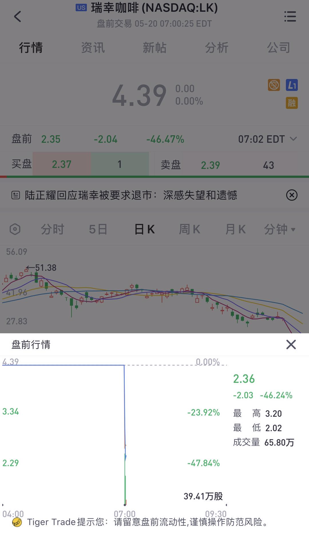 瑞幸咖啡复牌,盘前股价重挫46%,现报2.36美元,停牌前股价报4.39美元。