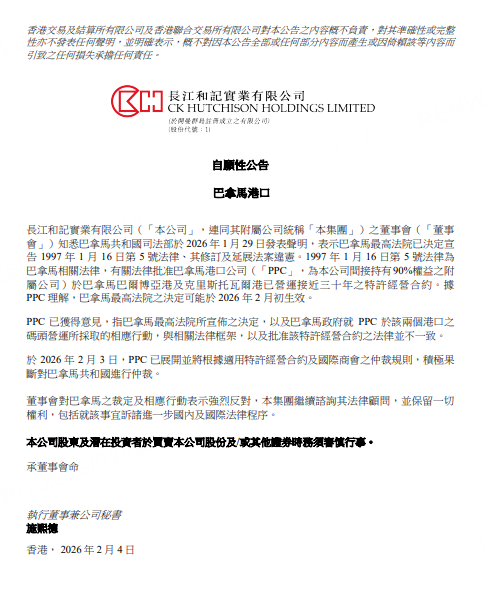长和在港交所公告称,巴拿马港口公司(PPC,为本公司间接持有90%权益之附属公司)已获得意见,指巴拿马最高法院所宣布的决定,以及巴拿马政府就PPC于该两个港口之码头营运所采取的相应行动,与相关法律框架,以及批准该特许经营合约之法律并不一致。 于2026年2月3日,PPC已展开并将根据适用特许经营合约及国际商会之仲裁规则,积极果断对巴拿马共和国进行仲裁。
