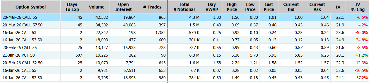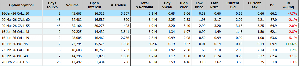 隔夜,英特尔涨超3%,期权合约成交69.04万张,1月16日到期的50美元的行权看涨期权交易量特别高,共有45,668份合约交易。 $INTC 20260116 50.0 CALL$