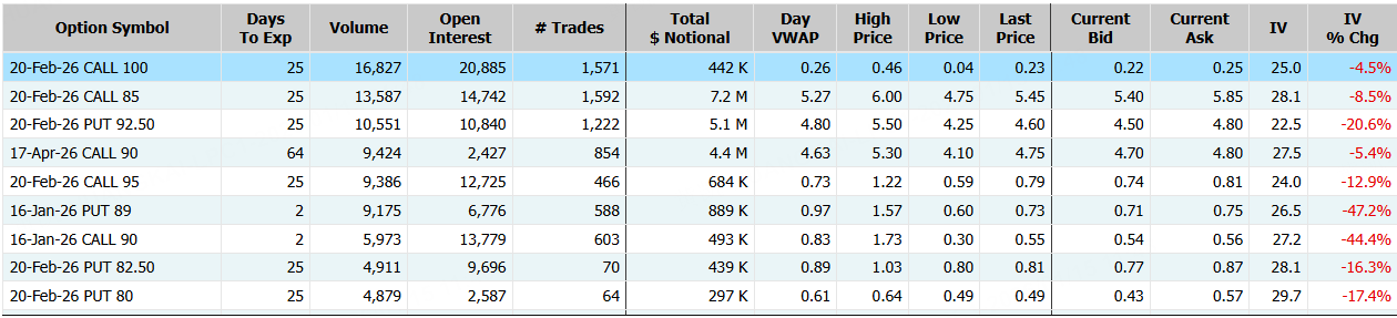 富国银行期权合约成交20.36万张,较90日均量放大3.9倍。2月20日到期的100美元的行权看涨期权交易量特别高,共有16,827份合约交易。 $WFC 20260220 100.0 CALL$