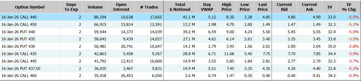 隔夜,特斯拉收跌1.79%,期权合约成交155.93万张,1月16日到期的440美元的行权看涨期权交易量特别高,共有80,194份合约交易。 $TSLA 20260116 440.0 CALL$