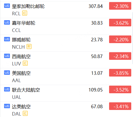 2月23日,航空、邮轮股盘初下挫,美国航空、达美航空、联合大陆航空跌超3%;嘉年华邮轮跌超3%,挪威邮轮、皇家加勒比邮轮跌超2%。