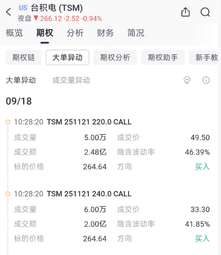 昨日台积电的期权大单异动中,排名前列的是两份CALL单买入,但行权价格值得关注,可能释放了多空博弈的信号。