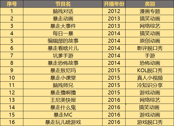 在这个模糊的思路下面,暴漫在2012年主推脑残对话系列,提高分享频率和品牌曝光度,吸收更多用户,同时把主心骨,KOL/网红王尼玛推到前端,并开始把业务重点从漫画社区转向网络综艺,模仿good news做了一个能输出观点的系列脱口秀,到2013年,这个节目正式改名叫《暴走大事件》。