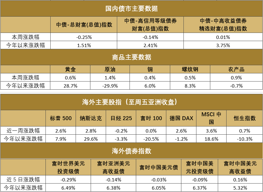 债券市场方面,本周高收益中资美元录得0.16%涨幅,其余主要美元债品种均出现下跌。