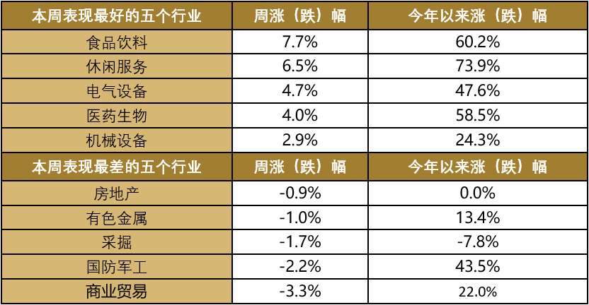 行业方面,本周申万一级行业涨多跌少。其中,科技类行业在本周表现出色,而周期类与消费类行业表现则较为分化。具体来看,科技类行业中除国防军工外,其余行业的表现均位于前列;周期类行业中机械设备、交通运输的涨幅较高,而采掘、有色金属、房地产的跌幅较大;另外,消费类行业中食品饮料、休闲服务、医药生物的表现居前,而商业贸易在本周领跌。
