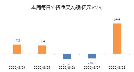 市场活跃度较上周有所回落,中证全指周日均成交额为8207.9亿元,较上周减少12%。外资方面,本周北向资金呈现净流入态势,全周流入79.5亿元。从十大成交活跃股来看,本周外资买入最多的前三名分别是:贵州茅台、宁德时代、立讯精密。