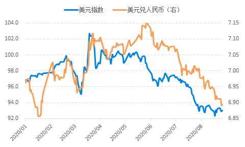 美元指数自月中下探至92以来,本周继续在92-93的区间内震荡。市场将周四鲍威尔关于货币政策制定框架调整的内容解读为不够鸽派,美元指数先跌后涨。我们认为92这一水平或成为美元指数的阶段性底部,短期内不应再过度看空美元。人民币兑美元中间价跌破6.9,升值明显,7月国内经济数据继续向好及市场对于中美关系紧张反应开始逐渐钝化是支撑人民币强势的重要原因。