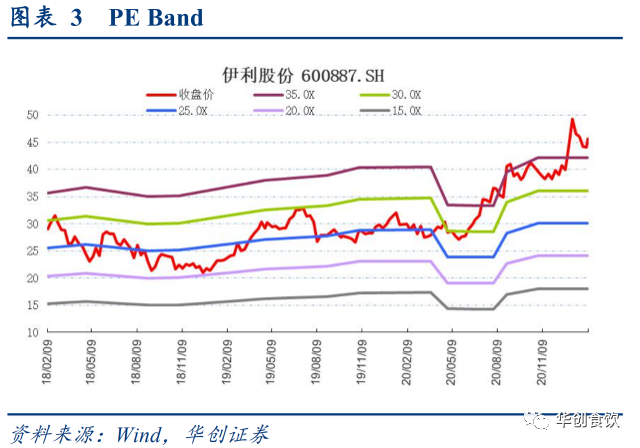 中期展望:白奶渐为新引擎,奶粉战略发力,推动伊利净利率水平恢复前期近10%高点。根据渠道反馈,20年金典、小白奶增长显著高于常温酸奶,且伊利21年推出金典A2有机奶、金典PET浓缩奶、臻浓高钙奶、富硒舒化奶等新品,进一步丰富白奶产品矩阵,而安慕希新品则以主打0蔗糖的小黑钻为主。同时,20年以来公司通过冠名热点综艺、与天猫超市签订娟姗奶3年30亿销售目标等方式,逐步加大金典推广。故需求较优叠加布局倾斜,白奶有望逐渐成为新引擎。此外,公司已对奶粉业务进行团队、配方、渠道及营销的全方位优化,抢抓内资品牌份额提升窗口。战略重点由“常温酸+康饮”向“白奶+奶粉”的高盈利组合转型,有望推动公司的净利率水平恢复至前期近10%的高点。