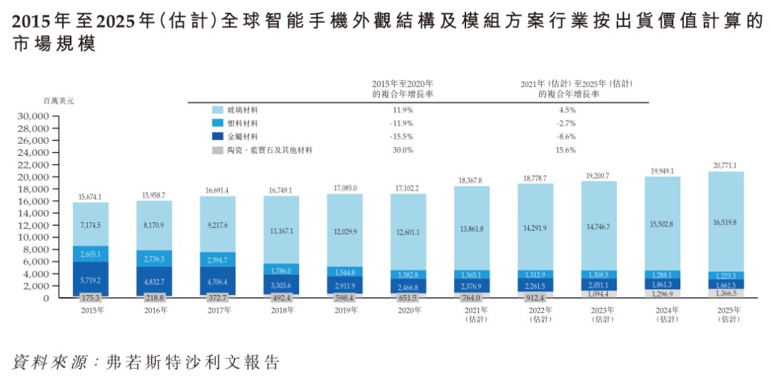 全球智能手机外观结构及模组方案行业按出货价值划分的使用玻璃的市场规模,于2015年至2020年按约11.9%的复合年增长率增长,预计将于2025年将达到165.20亿美元。相反,该行业使用塑料和金属的市场规模,下滑趋势将会持续。