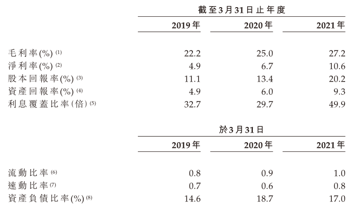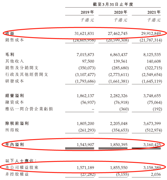 截至2019年、2020年及2021年3月31日止年度,伯恩光学的收益分别为316.22亿港元、274.63亿港元及299.13亿港元,而伯恩光学的年利润分别为15.44亿港元、18.50亿港元及31.60亿港元,同比增长19.9%、70.80%,其中归本公司权益股东利润分别为15.44亿港元、18.56亿港元及31.58亿港元。