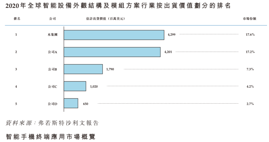 伯恩光学在2020年全球智能设备外观结构及模组方案行业按出货价值划分的排名第一,约42.99亿美元,占据17.6%市场份额。