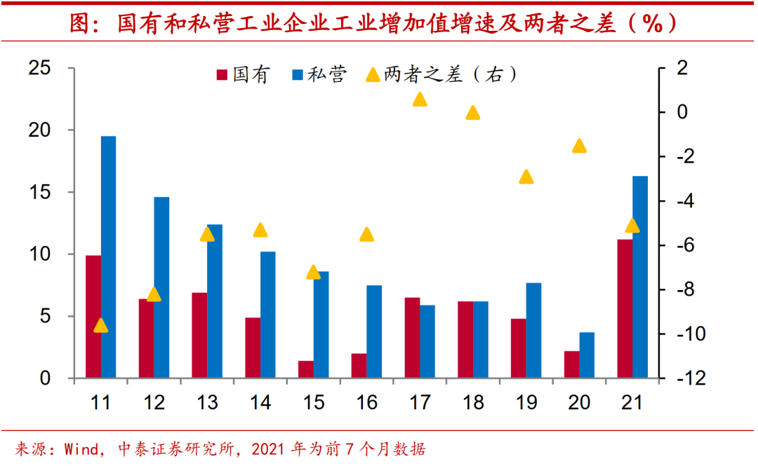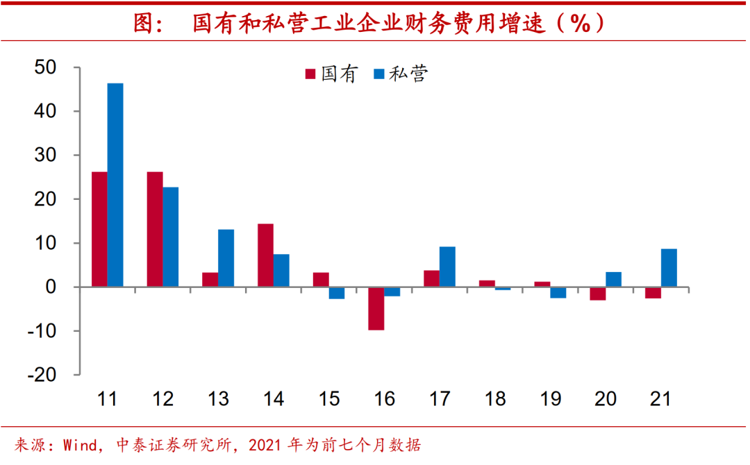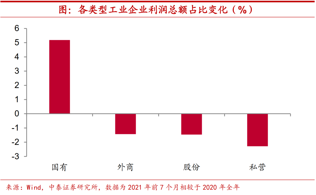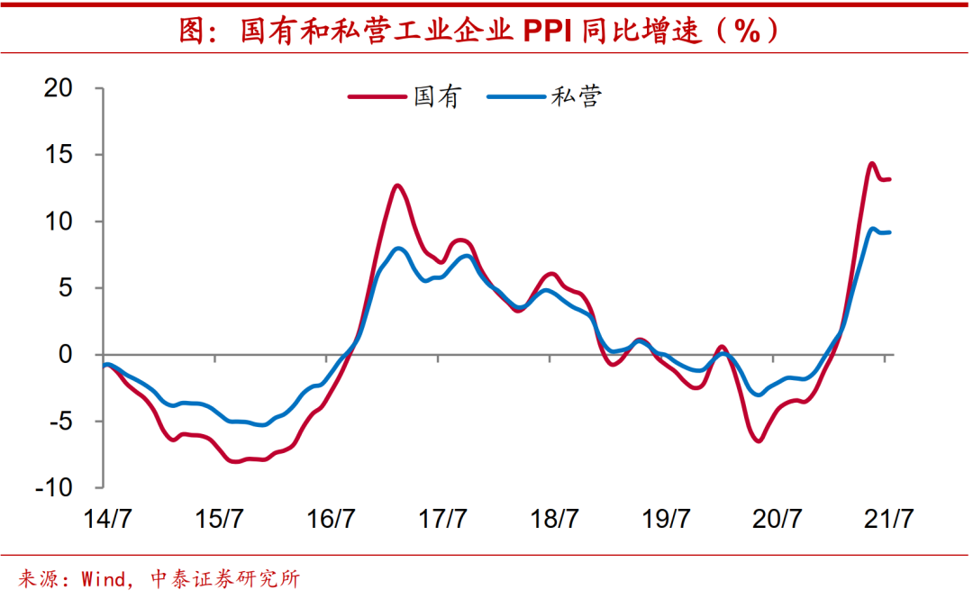 提价幅度不及国企。价格变化能够部分解释国企和民企之间的利润分化,今年以来民企提价幅度不如国企。根据我们的估算,今年前七个月国有及国有控股工业企业PPI同比增速超过8%,高于同期私营工业企业PPI增速2.5个百分点左右。但由于“量”、“价”两方面因素的对冲,两者营收增速差距不大,今年前七个月私营工业企业营收增速仅高出国有及国有控股工业企业0.5个百分点。
