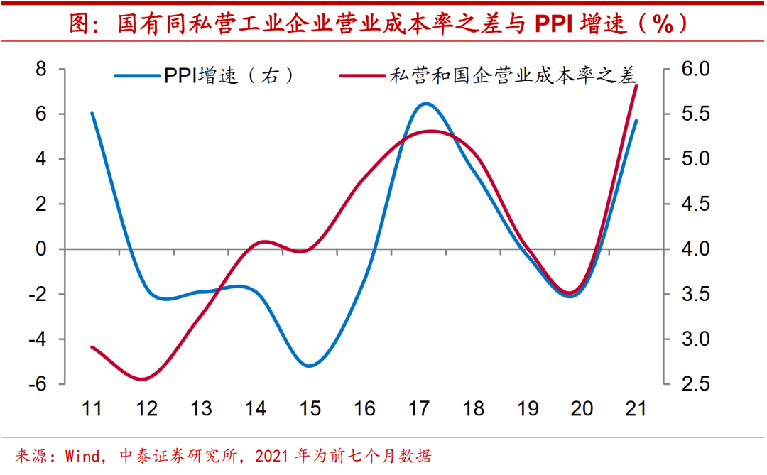 大宗涨价,民企买单。民企成本压力的上升很大程度上源于上游大宗商品价格的上涨。根据历史经验来看,私营和国有工业企业营业成本率差值与PPI同比增速走势高度相关。国企在资源型行业的集中意味着民企成为了上游涨价的“买单者”。