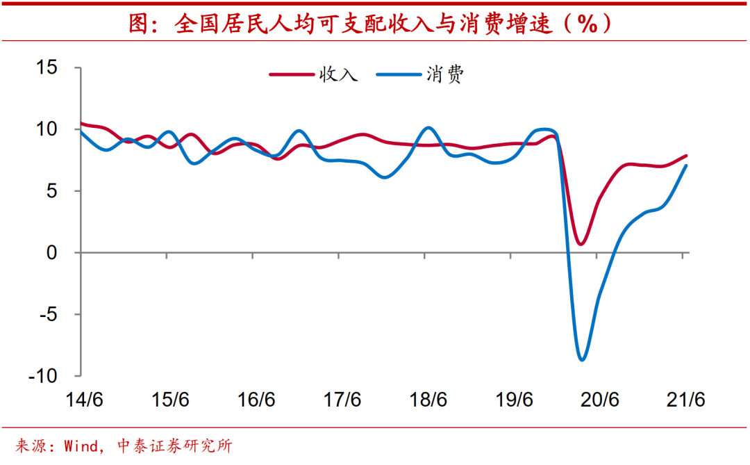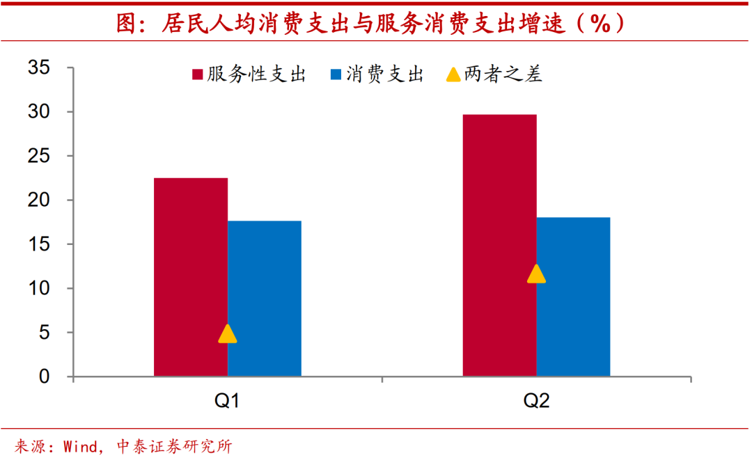 消费稳定经济。事实上,消费曾是疫情后稳定经济增长的重要力量。按照两年年均增速来看,1季度全国居民人均可支配收入增速7%,2季度进一步修复至7.9%,与疫情前8%-9%的水平颇为接近。而1季度全国居民消费支出增速接近4%,2季度进一步提升至超过7%,2019年上半年消费支出增速也就在7%-8%左右。特别是在服务消费方面,2季度增速较消费支出整体增速高出11个百分点。