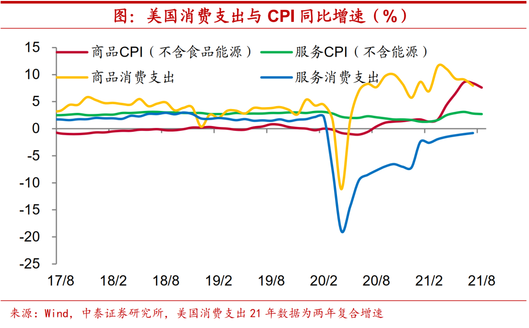 增速难以快速下行。美国通胀走高虽然和货币“放水”不无关系,不过,其也受到经济需求恢复的拉动。如果按照两年年均增速来看,今年美国商品消费支出增速一直处于5%以上,使得商品CPI增速也随之高企。而随着疫情制约逐渐减弱,服务消费支出增速的恢复也将带动相关价格的上行。美国通胀增速中枢短期难以显著下移。