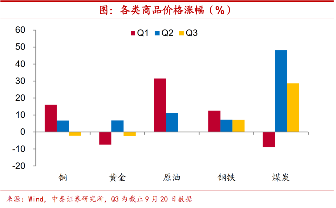 输入因素淡出,需求拉动有限。从价格端来看,今年一季度我国工业品价格上涨确实具备一定的输入型特征,全球定价的原油和铜价格涨幅突出,但二季度以来,国内定价的钢铁和煤炭价格显著上行,特别是三季度两者价格涨幅在大宗商品中领跑,输入型因素逐渐淡出。特别值得注意的是,本轮PPI增速的上行,和过去几轮最大的不同,在于需求端的拉动极为有限。