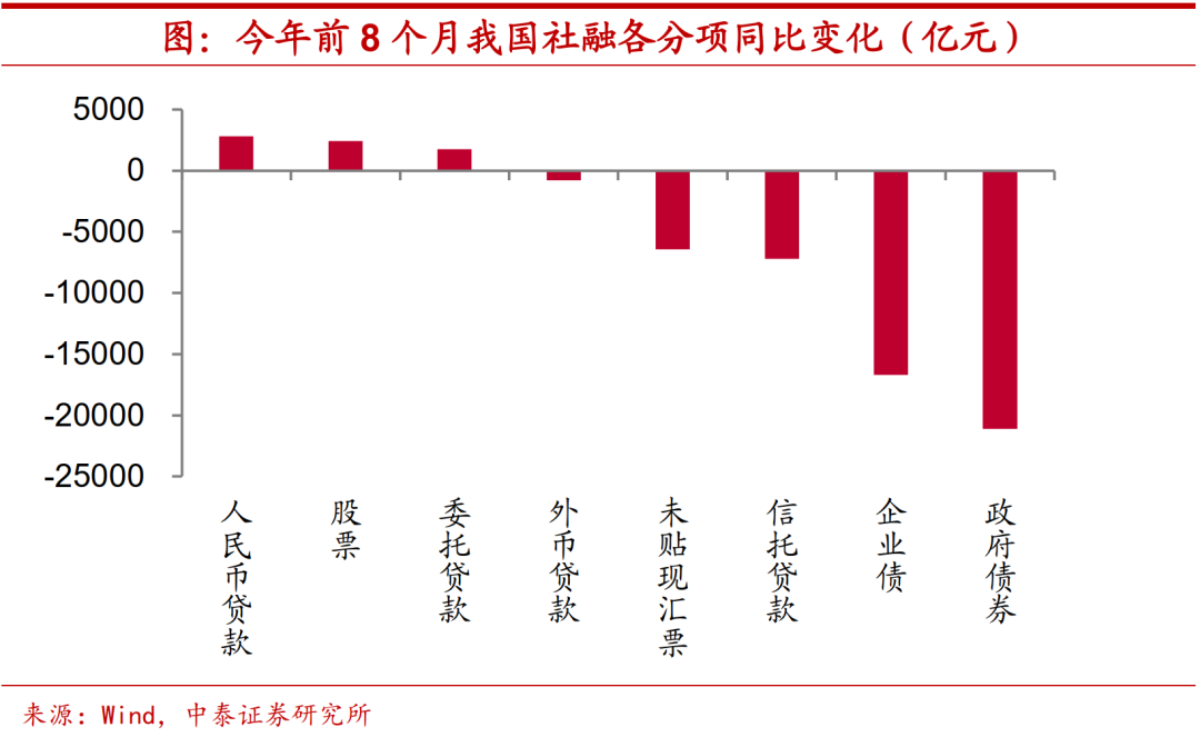 从社融数据上来看,今年前8个月企业融资拖累主要来自于非标融资的收缩和企业债融资的同比削减,此外,政府债券发行的减少也是拖累社融增加的重要原因之一。