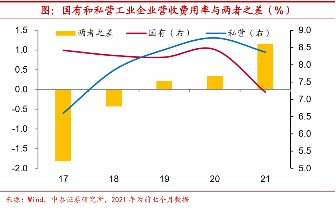 国企费用大幅改善。另一方面,虽然今年以来两者费用压力都有缓和,但民企改善幅度远低于国企。今年前七个月国有及国有控股工业企业营收费用率由去年底的8.4%下降至7.2%,而同期私营工业企业仅从8.8%降至8.4%,两者之差也扩大至超过1个百分点。