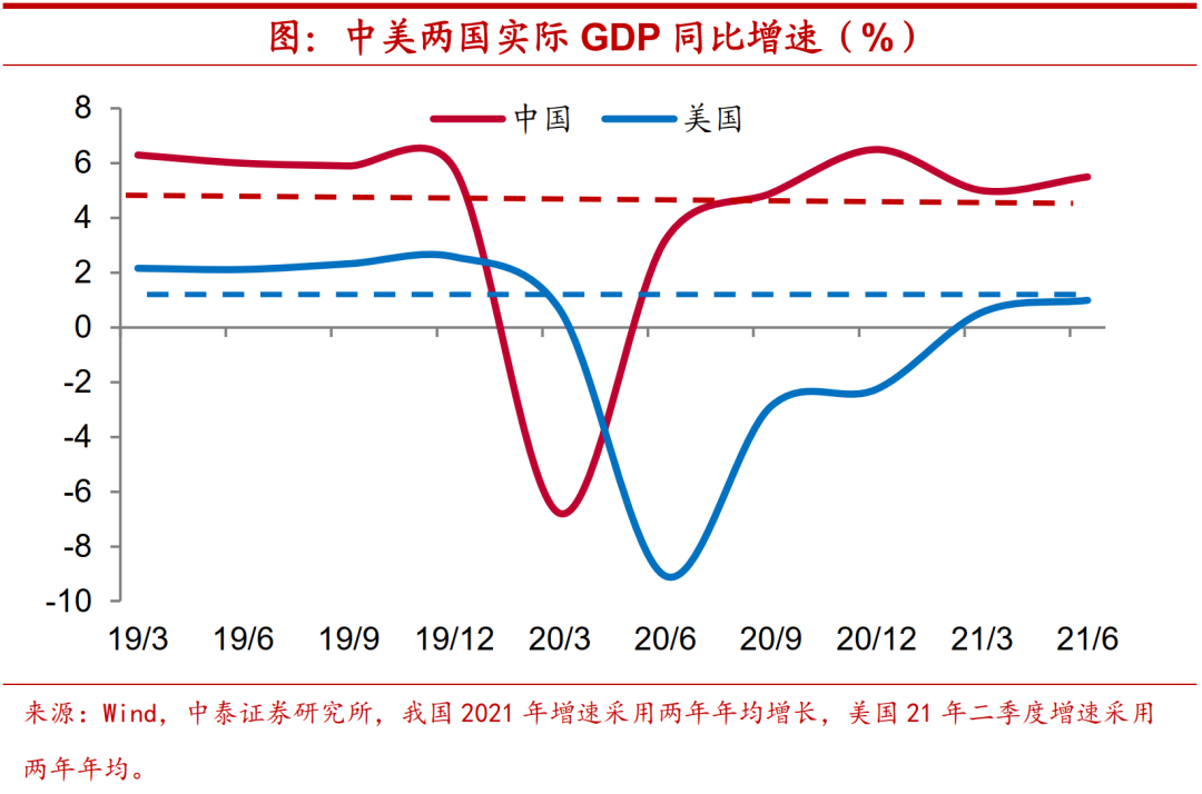 经济回升动能有限。尽管美债利率可能由降转升,但上行幅度相对有限。从疫情后的经济恢复路径来看,我国在经济增长达到疫情前6%左右的增速水平后步入稳态,维持在5%-6%的窄幅区间震荡,而美国的情况与此类似,二季度美国实际GDP增速(按两年年均计算)已达1%,与疫情前水平已较接近,美国经济复苏斜率明显趋于平缓。