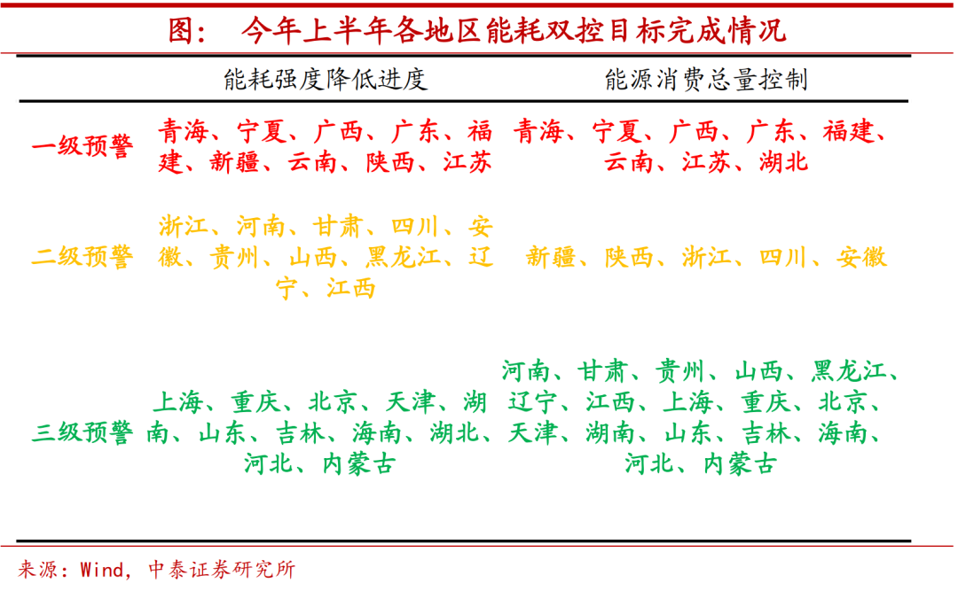 能耗双控压力不减。当前经济和就业结构矛盾的解决,从政策取向上来看,首先,最为简单和直接的办法就是减缓甚至改变大宗商品价格上涨的势头,但在能耗双控政策推进的背景下,短期价格高位的情况或难有明显改观。根据发改委公布的今年上半年各地能耗双控目标完成情况,仍有不少省份处于一级预警区间,而像云南等地近期多行业能耗管控进一步趋严。