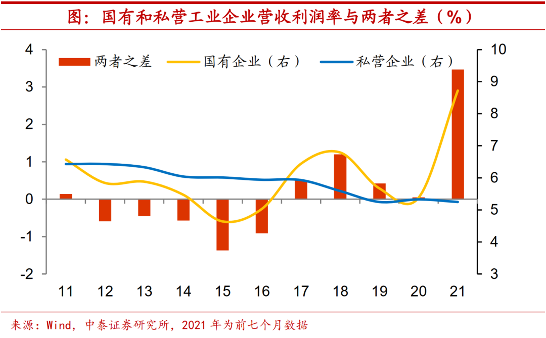 利润率差异才是关键。因此,国企和民企利润分化的决定因素还是在于利润率的差异。今年前七个月国有及国有控股工业企业营收利润率高达8.72%,较去年年底提高了超过3个百分点,与此同时,私营工业企业营收利润率却从去年年底的5.33%下滑至5.25%,同国有工业企业的差距也扩大到接近3.5个百分点。