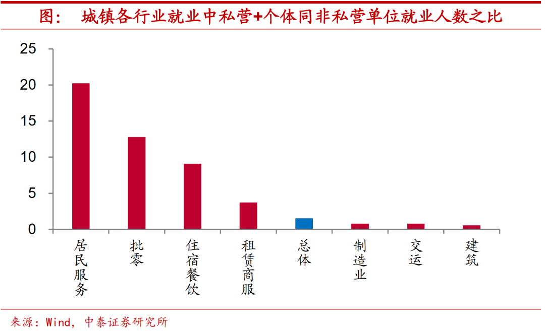 民企拖累就业,调控势在必行。年轻人口就业占比较高的行业,恰恰是由民企解决更多就业岗位的行业。比如在居民服务行业,16-24岁年龄就业人口占比要高出25-59岁年龄就业人口超过3个百分点,这一行业城镇私营加上个体就业人数约是非私营单位就业人数的20倍,而从整体情况来看,城镇所有行业就业中私营加个体就业人数才只有非私营单位就业人数的1.5倍。因而,民企经营情况不佳拖累年轻就业人口失业率不断走高。在就业优先的战略导向下,宏观政策调控势必要对此加以应对。