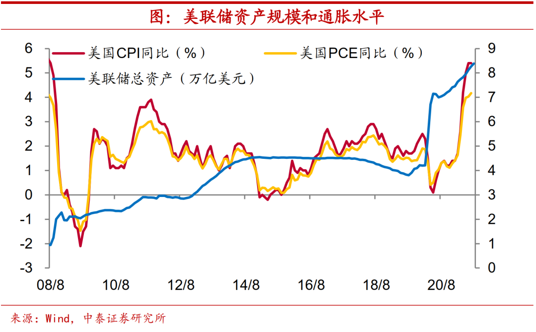 通胀倒逼政策转向。美联储大幅扩表购债,在一定程度上引发了通胀水平的高企,美国CPI同比增速已经超过5%,PCE同比增速也超过4%。虽然就业情况欠佳,但通胀会倒逼其货币宽松政策的转向。
