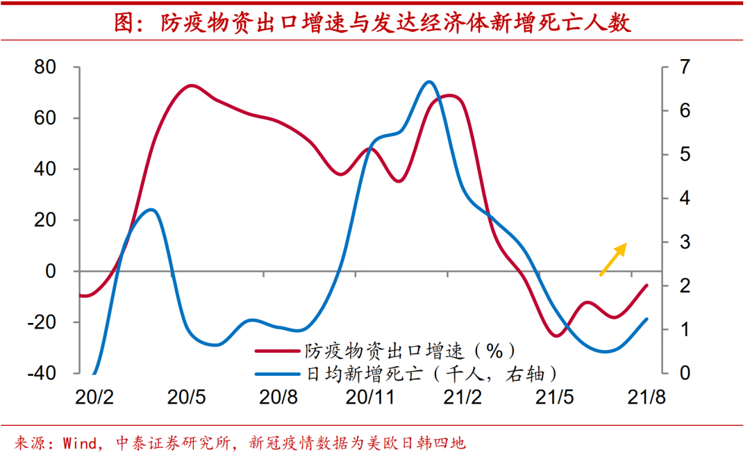 出口拉动仍将减弱。除去地产和基建之外,在疫情出现缓和的情况下,出口对于经济增长的拉动作用也将趋于减弱。今年以来我国出口的韧性,一方面,来自于出口品价格的增长,另一方面,从根本上来看,还是和全球疫情的蔓延有关。如发达经济体新增死亡人数的上升带动我国防疫物资产品出口增速低位回升。