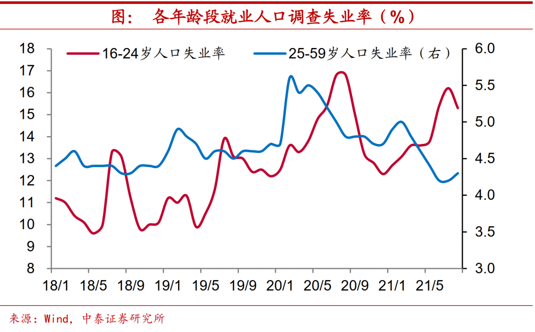 扩产意愿不强,失业居高不下。利润增长相对迟缓使得民企投资并不积极,产能扩张速度偏慢。而产能与就业实乃一体两面,虽然失业率整体水平仍较稳定,但同企业利润表现类似,分化特征也很突出。25-59岁年龄就业人员调查失业率从年初的高位一路下滑,但年轻年龄人口就业形势不容乐观,16-24岁年龄就业人员调查失业率已突破15%,距去年创下的历史新高仅一步之遥。