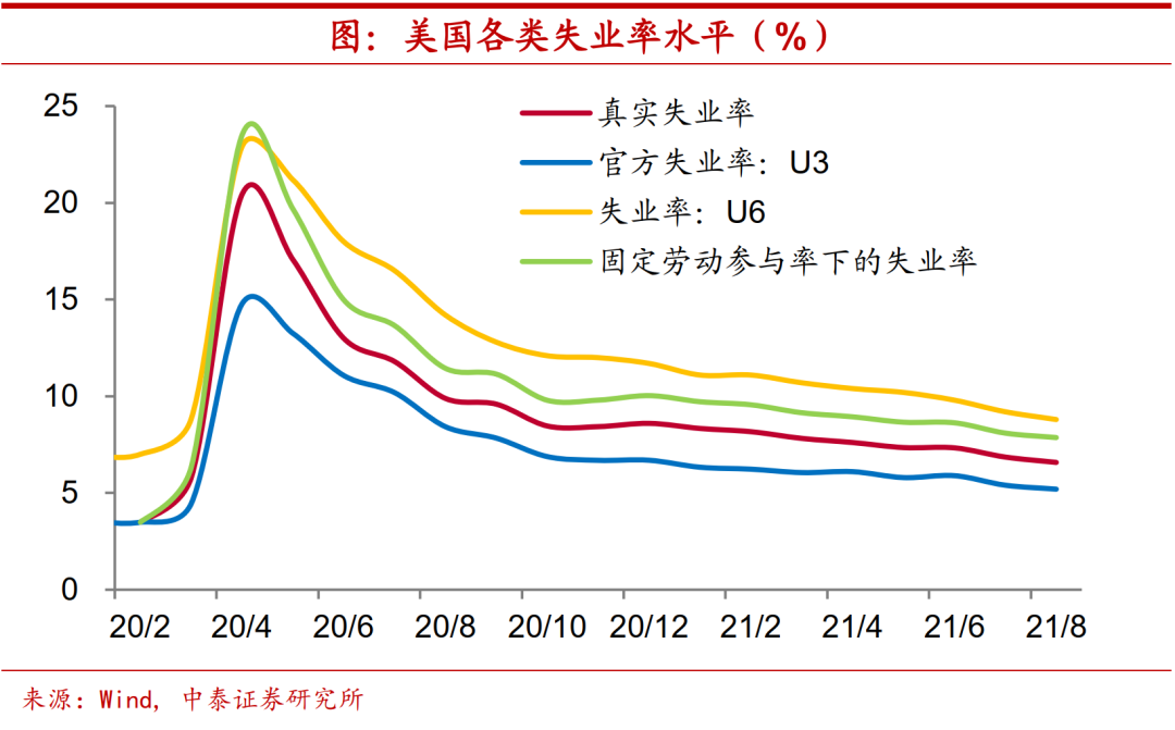 8月美国非农就业人数回补了疫情后缺口的76.2%,虽高于上一轮释放Taper信号时期,但较宣布实施Taper时期的88.2%仍有不小的距离。而且按照固定劳动参与率的失业率水平计算,当前仍有7.9%,远高于疫情前水平。