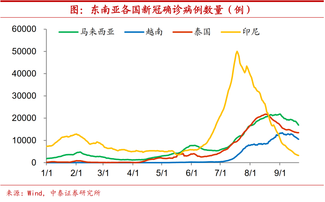 疫情缓和替代加强。此外,东南亚等新兴经济体疫情的蔓延,使得出口订单向我国回流,带动机电和劳动密集型等相关出口产品的高增长,如马来西亚集成电路产品出口增速和我国呈现此消彼长。但由于9月以来,马来西亚、印尼和越南等国新冠确诊病例数量已经见顶回落,疫情的缓和或将使出口订单再度外流。