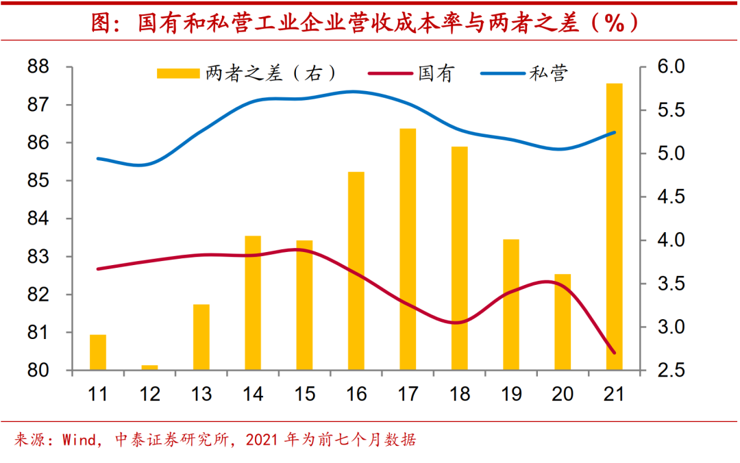 成本走势反差鲜明。如果进一步对利润率变化进行拆解,一方面,国企和民企成本端的走势形成鲜明的反差。今年前七个月国有及国有控股工业企业营收成本率由去年底的82.2%下降至80.5%,而同期私营工业企业却从85.8%提高到86.3%,两者之差突破了5.8个百分点。