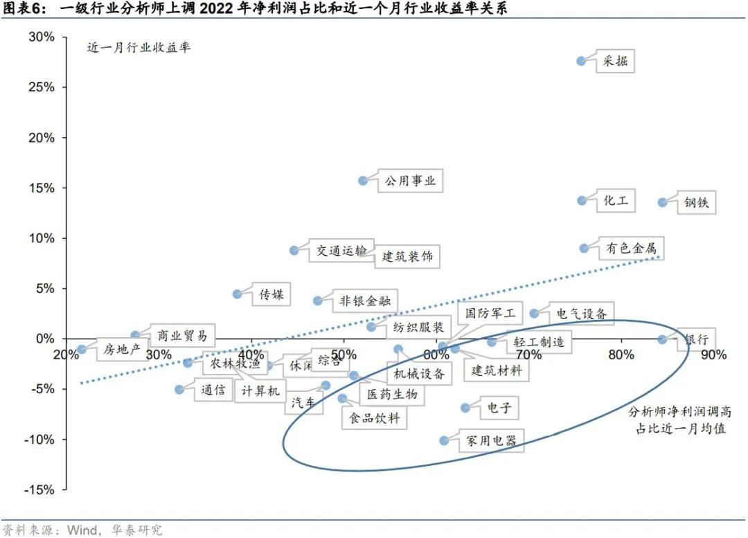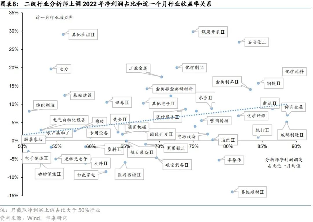 以上述两个指标任意一个大于70%为筛选标准,我们整理了分析师预期景气度比较高的二级行业列表。可以看到主要的上游资源类周期行业均出现在列表中,而且近一个月具有较好的市场表现。考虑到上游资源类行业较为拥挤,我们建议关注近期股价出现回调,但是分析师预期盈利概率仍然较高子行业,分版块来看: