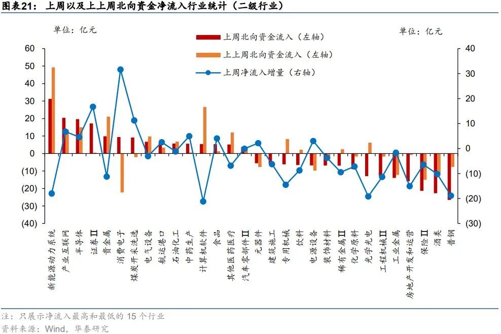 从行业层面来看,上周加仓最多的行业是电力设备及新能源(31.23亿元)、计算机(30.50亿元)、电子(13.04亿元),减仓最多的行业是钢铁(-30.42亿元)、食品饮料(-23.97亿元)、机械(-17.69亿元)。深入到子行业视角来看,新能源动力系统、产业互联网、半导体加仓最多,保险Ⅱ、酒类、普钢减仓最多。