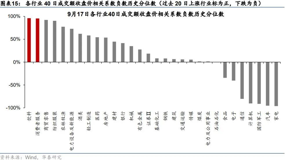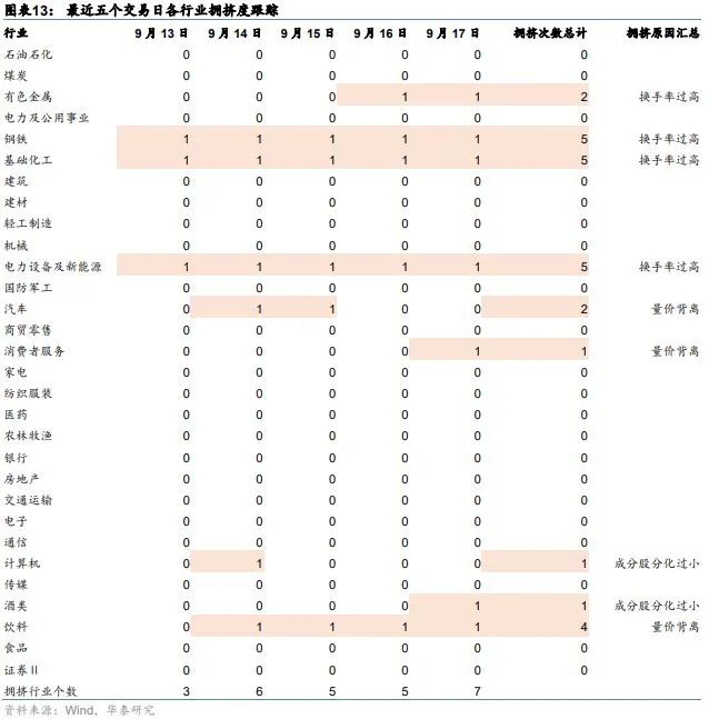 上周股市冲高回落,各行业普跌,沪深两市日成交额下降至1.3万亿水平,前期表现强势的有色金属和钢铁行业回调幅度较大。市场整体拥挤度处于较高水平,总计有九个行业上周出现了拥挤现象。具体到行业层面来说,有色金属、钢铁、基础化工、电力设备及新能源行业换手率2005年至今历史分位数大于90%,成交热度高于平均水平,存在拥挤风险。消费者服务、汽车和饮料行业近期成交额和收盘价相关系数处于历史低位,存在量价背离风险。计算机、酒类行业成分股分化较小,资金过于集中。