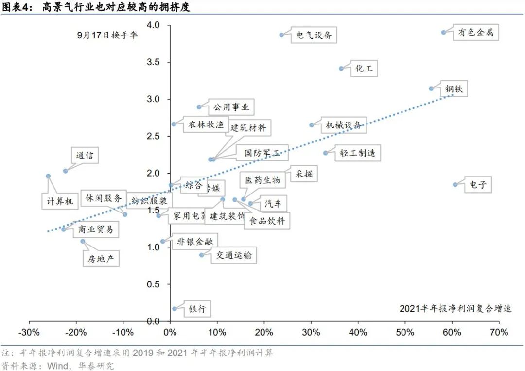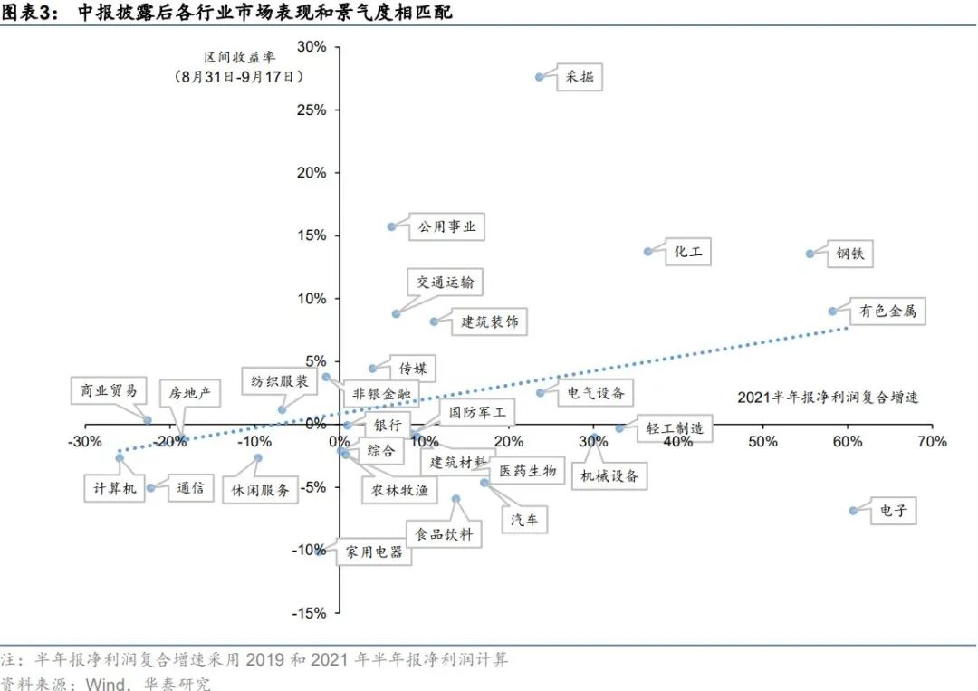 具体来说,中报披露前后市场对于周期板块的高景气状态达成共识。横向比较来看,有色金属、钢铁、化工等上游资源类行业以及电力设备等成长行业半年报净利润复合增速处于市场前列(采用2019和2021年半年报净利润计算)。高景气行业的业绩也得到了市场反馈,从8月31日至今各行业的涨幅和净利润增速成明显的正相关关系。