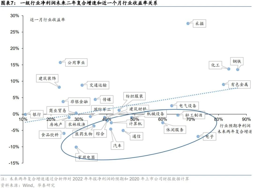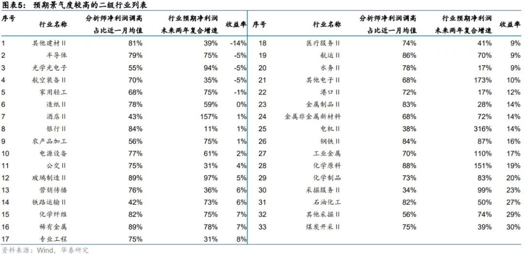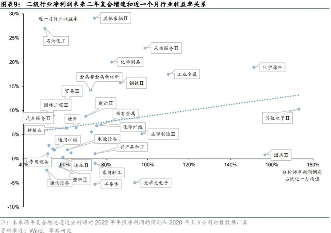 我们选取分析师净利润调高占比(与一个月前相比)以及行业预期净利润未来两年复合增速两个指标来对细分行业预期景气度进行刻画,具体来说: