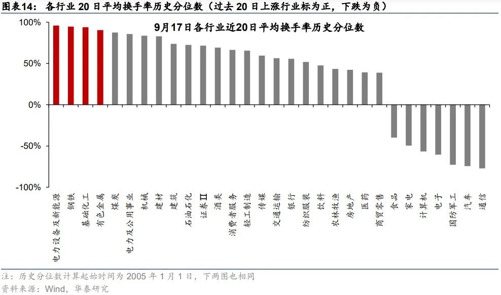 不过我们也同样注意到的是,近一个月左右涨幅较高的电力设备、上游资源筑等行业交易热度上升明显,换手率超过了平均水平3-4倍左右,达到90%以上的历史分位。现在进入高拥挤方向进行存量博弈的性价比正在逐渐降低,从上周市场表现来看,有色金属、钢铁、建筑等行业单周下降幅度在7%以上,上涨的一致预期出现松动。所以从配置上,我们建议关注景气度较高,但是尚未出现拥挤的细分行业。