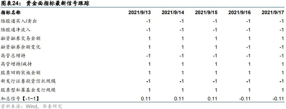 在《A股择时之资金面指标测试》(2021-07-02)中,我们在产业资本和境外机构投资者、境内机构投资者、境内个人投资者等各资金类型中遴选和构建代表性指标,并采用统一的择时框架进行测试,筛选出9个有效的择时指标,并基于单指标测试结果构建多指标择时策略。根据2021年9月19日最新建模结果,融资融券交易金额、高管增持/减持、股票回购实施金额、新发行证券投资信托产品发行规模发出看多信号,陆股通买入/卖出、陆股通资金净流入、融资融券余额变化、高管总增持、股票私募基金管理规模变化,在[-1~1]区间中,加总信号得分为-0.11分,整体谨慎看空。